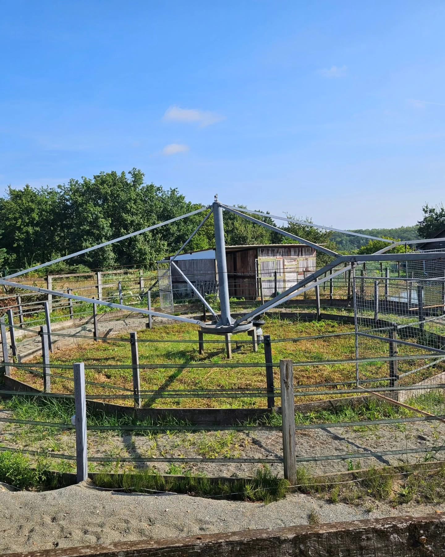 Le haras dispose d’un marcheur 4 places, un équipement spécialement conçu pour faire marcher les chevaux en toute sécurité. Il permet de les échauffer avant le travail, de les détendre après l’effort ou encore de maintenir leur condition physique en complément des séances montées.